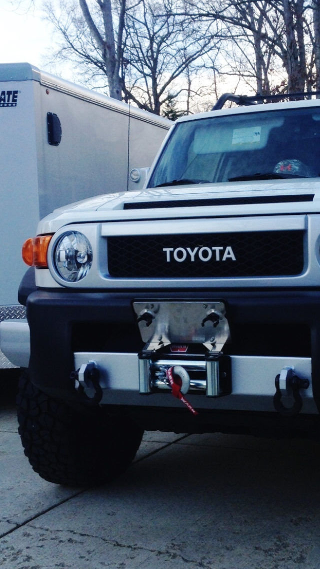 From Maria in Maryland. Warn 9500 CTi fits perfectly. Painted silver to match stock FJ plastic and a flip up license plate for a very clean installation. Nicely done!