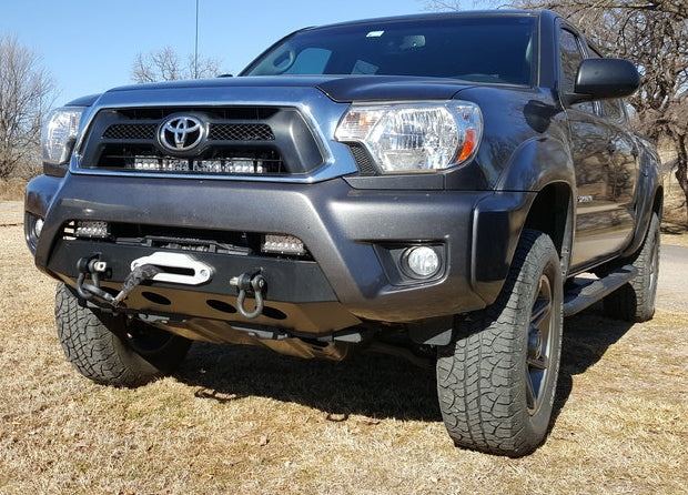 Zack from Oklahoma sends us a photo of his 2013 Tacoma with our winch bumper, Van Beest shackles and a Smittybilt X20 winch. He also optioned for our special Teflon powder coating. Lights are generic. Looks great!